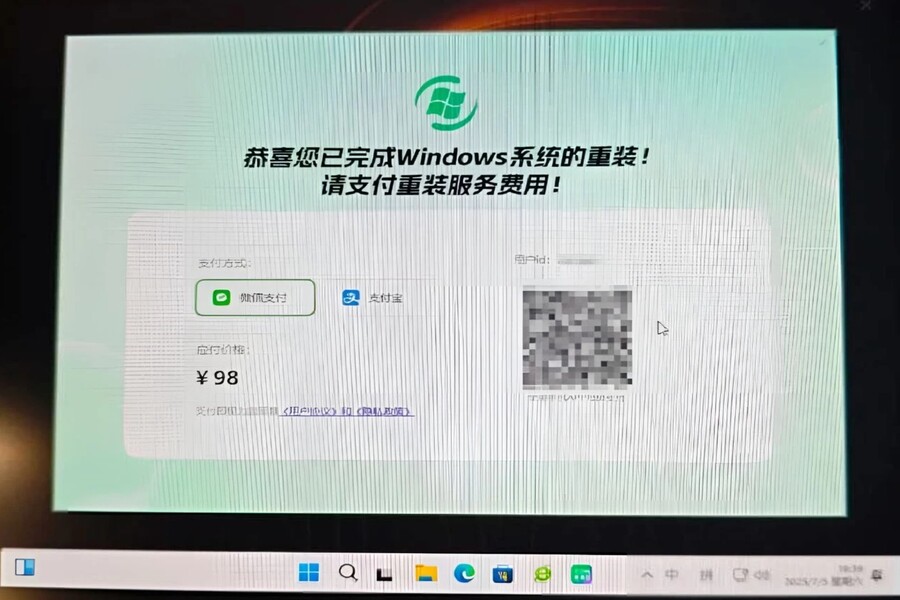 Sau khi quá trình “cài đặt” hoàn tất, màn hình máy tính không hiển thị giao diện Windows thông thường, mà thay vào đó là một bảng thông báo toàn màn hình bằng tiếng Trung Quốc, với nội dung: “Chúc mừng, bạn đã hoàn tất việc cài đặt lại Windows. Để tiếp tục sử dụng máy tính, vui lòng thanh toán phí dịch vụ 98 tệ qua Alipay hoặc WeChat Pay.”